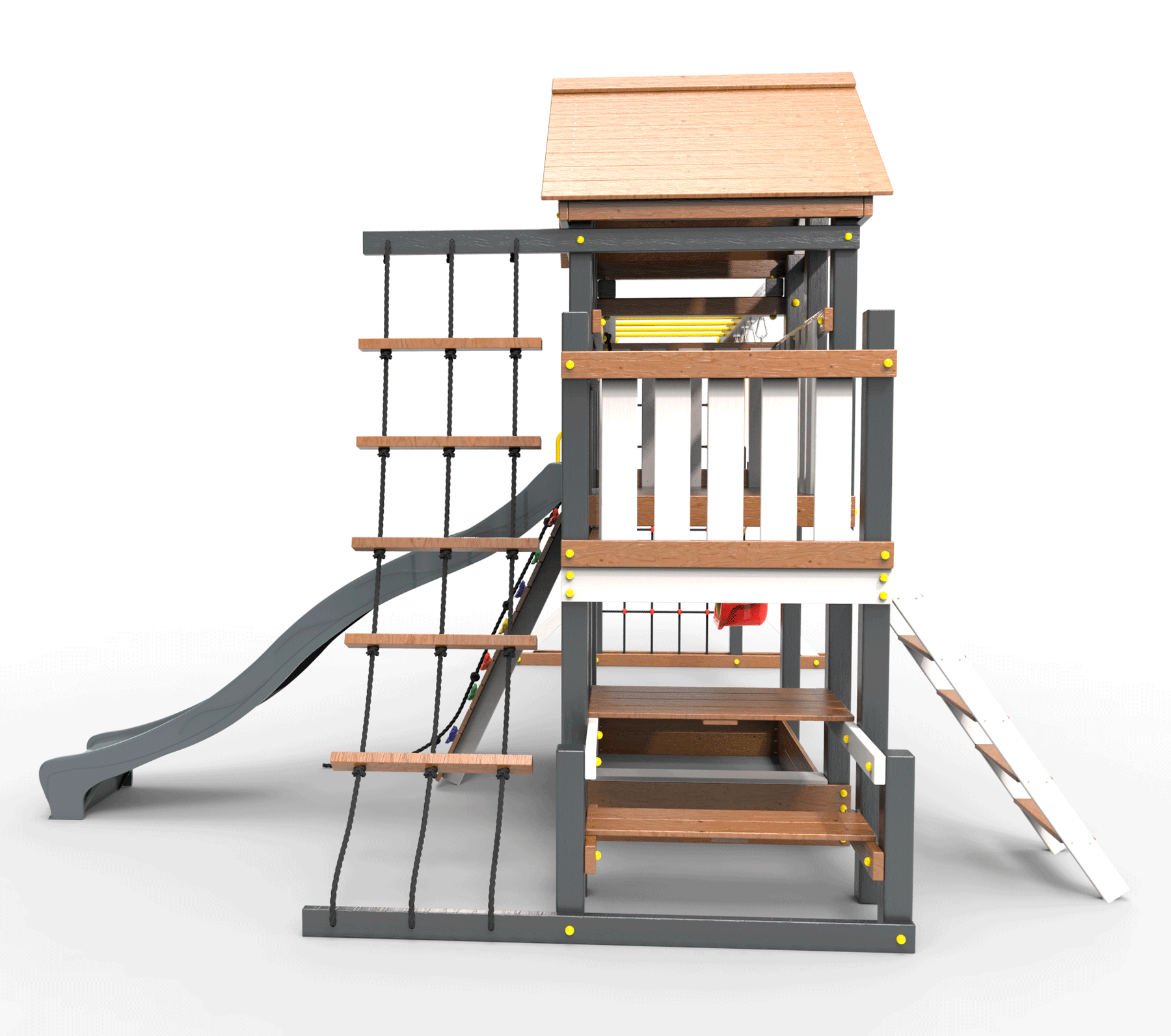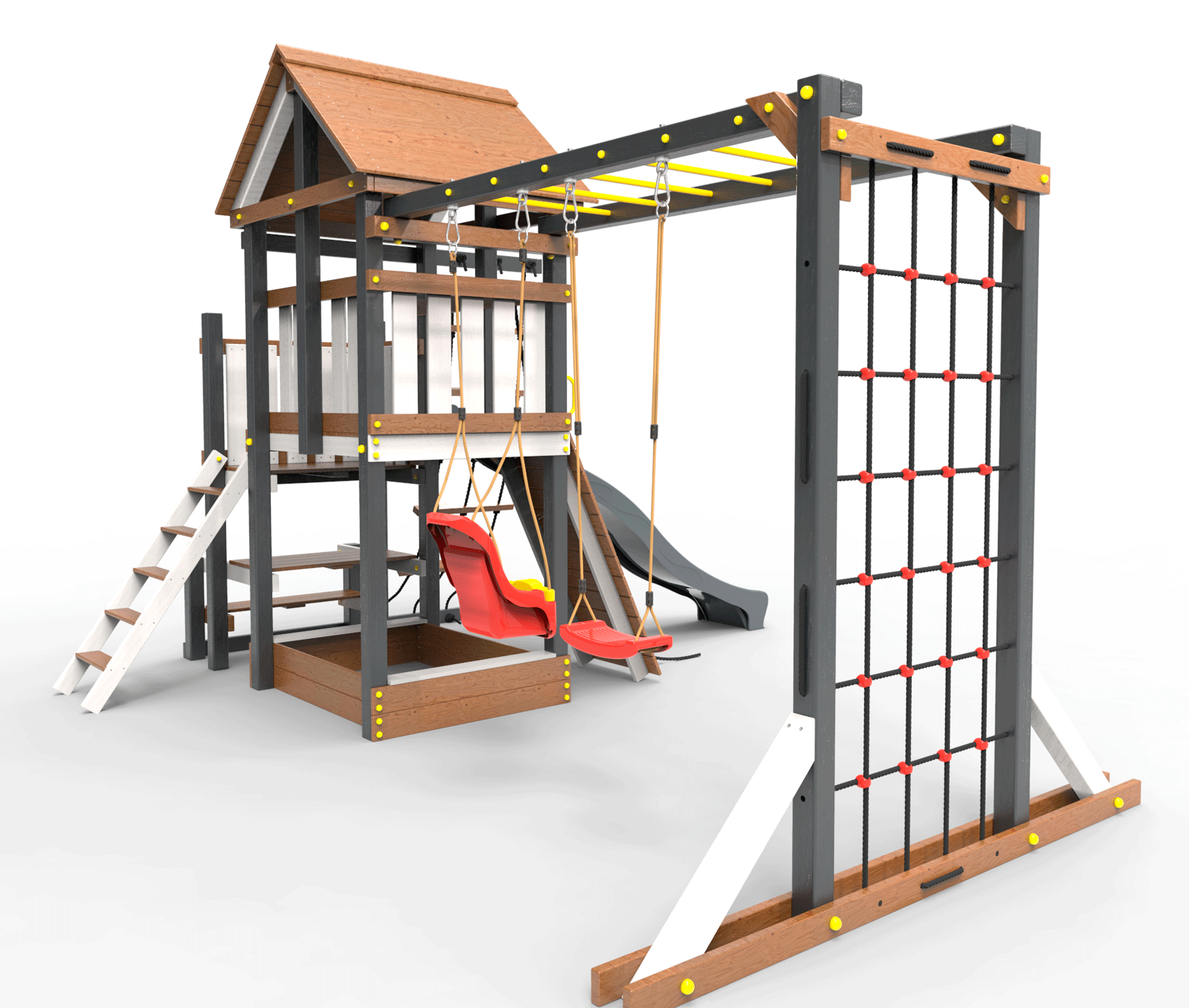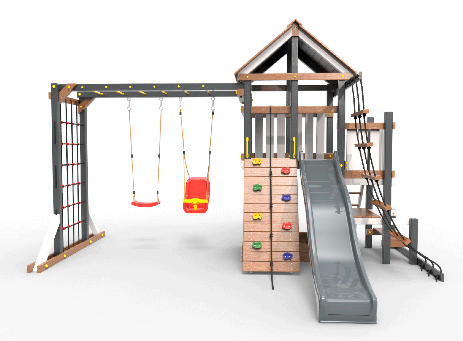Обращаем Ваше внимание, что фактический цвет детской площадки может отличаться от представленных фото на сайте. Специфика окраски нетоксичными пропитками и красителями допускает отклонения в цветовой гамме отгружаемых изделий. Также обратите внимание, что фактический цвет может отличаться из-за цветопередачи устройства на котором Вы смотрите фото. Производитель оставляет за собой право менять цвет отдельных деталей и комплектующих(включая пластик, канаты и пр.), при этом сохраняя весь функционал и характеристики товара.