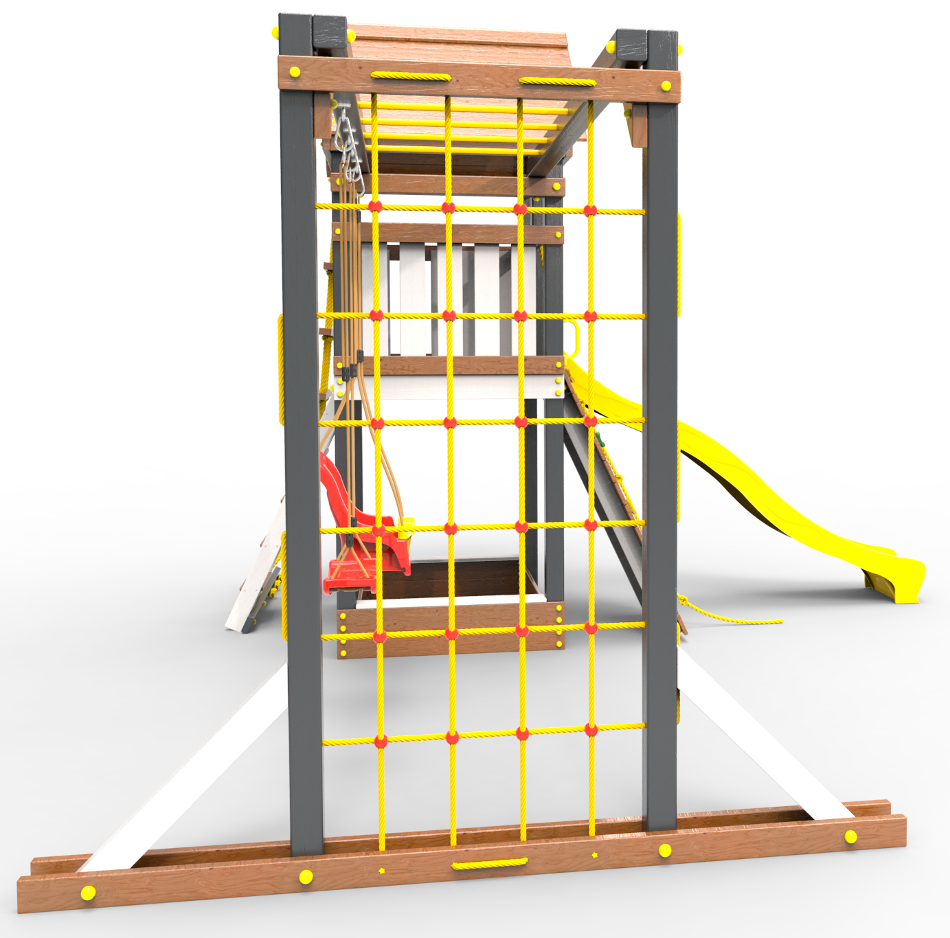 -опоры игрового домика изготовлены из многослойного клееного соснового бруса толщиной 90мм с закругленными углами диаметр 20мм;