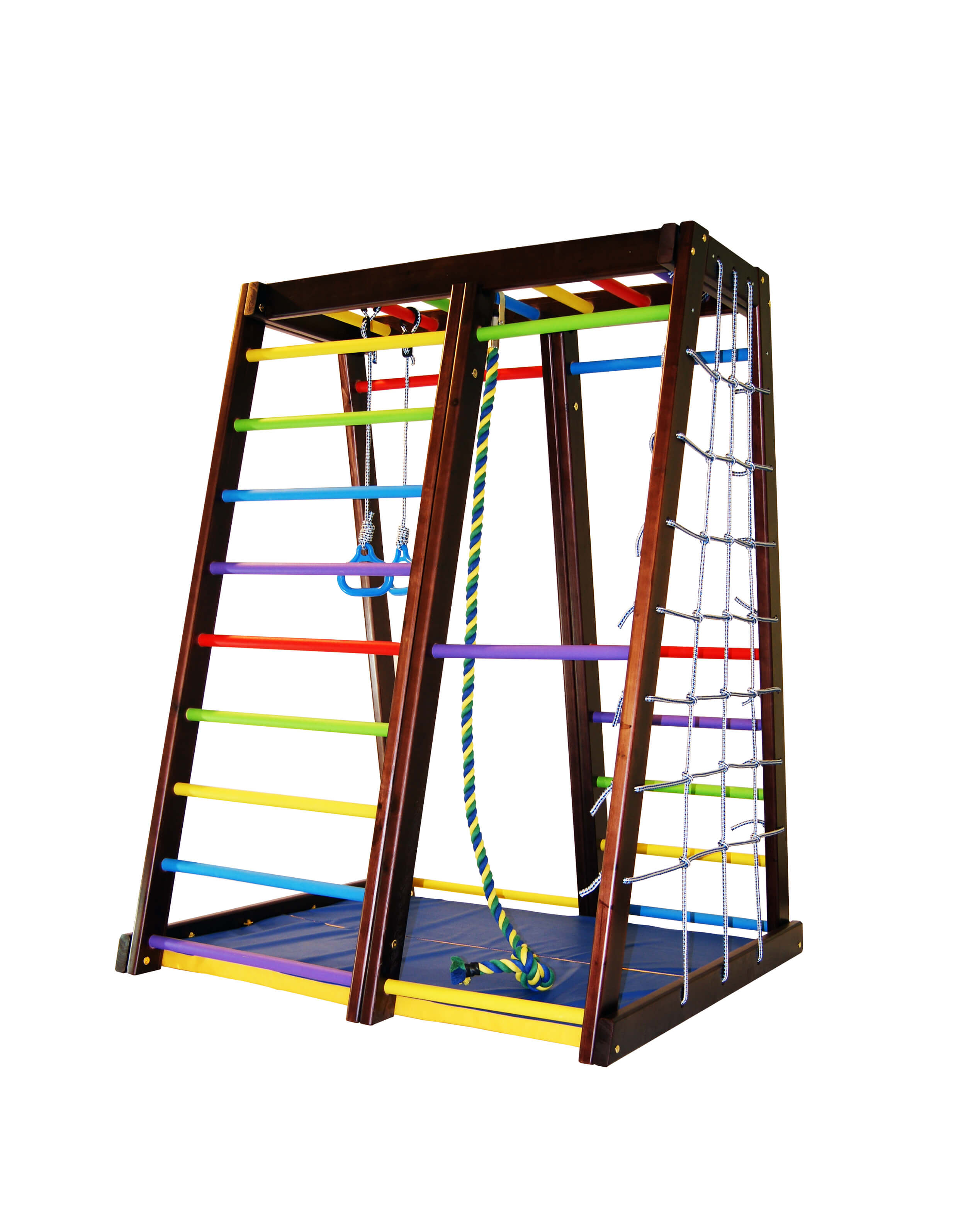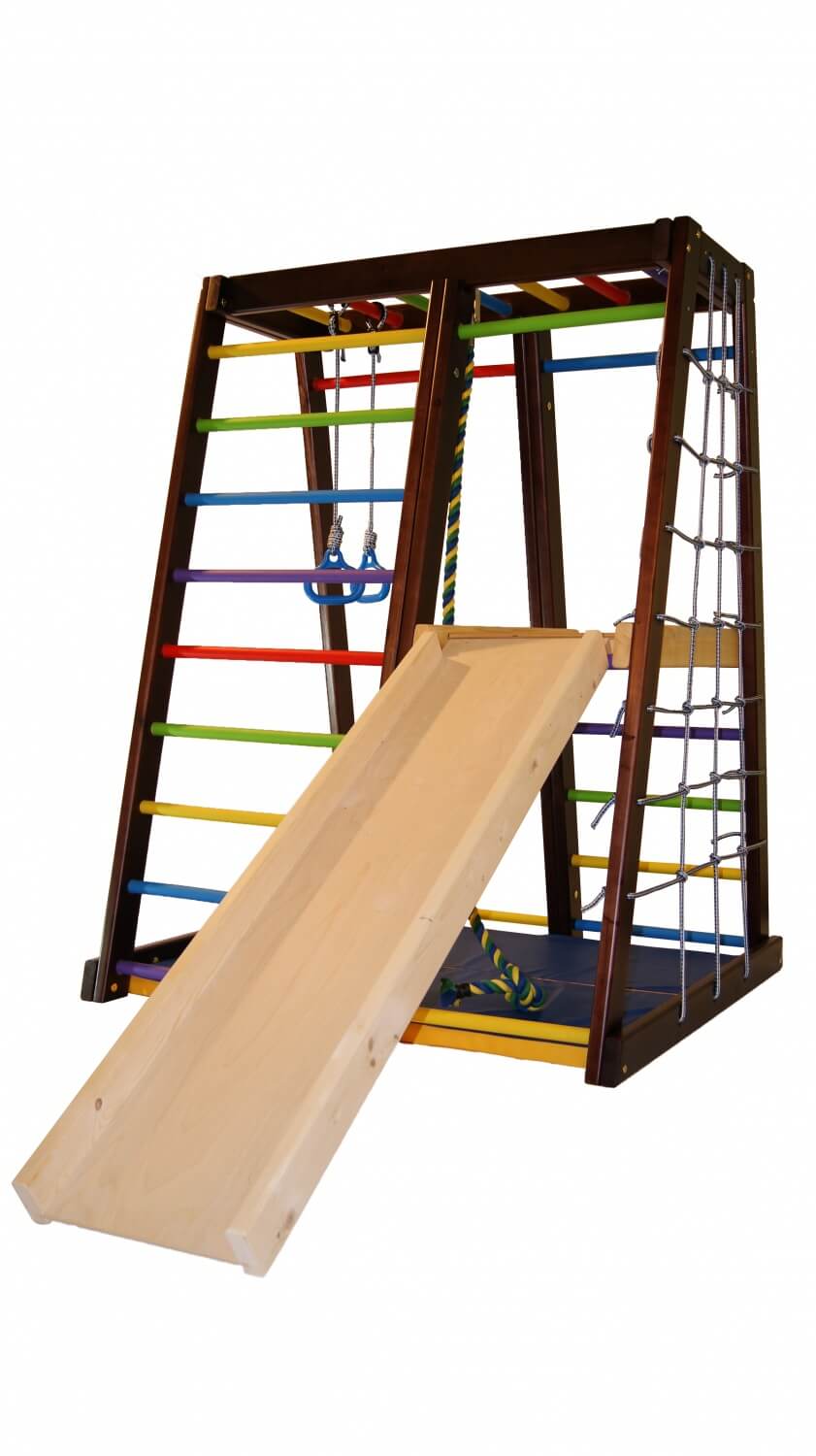 - максимальная комплектация включает в себя шведские стенки, рукоход, сеть для лазанья, страховочный мат, канат, гимнастические кольца, а также горку с удобной площадкой.