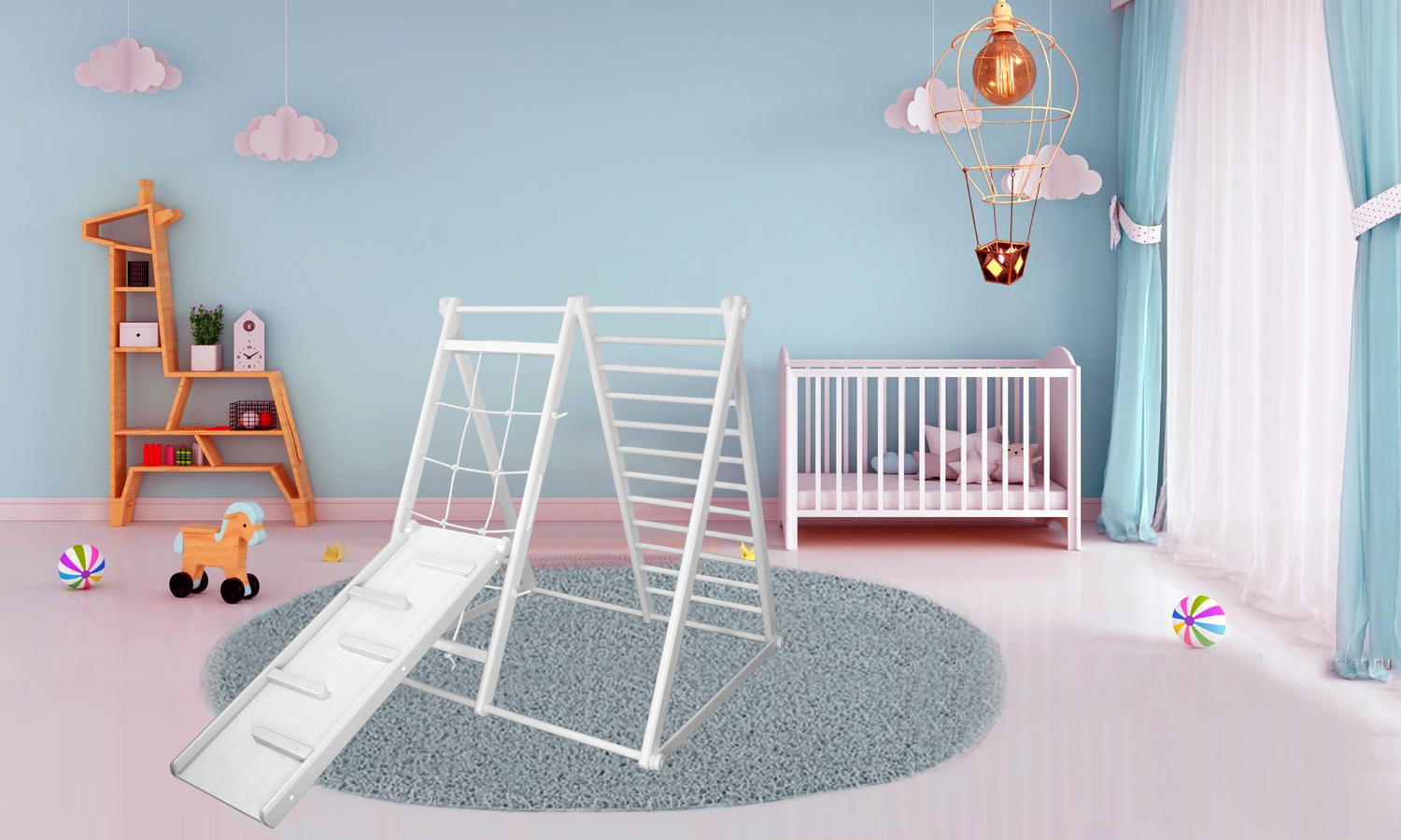 Универсальная складная компактная конструкция выполнена из натурального дерева, все края деталей немного скруглены обеспечивая большую безопасность для ребенка.