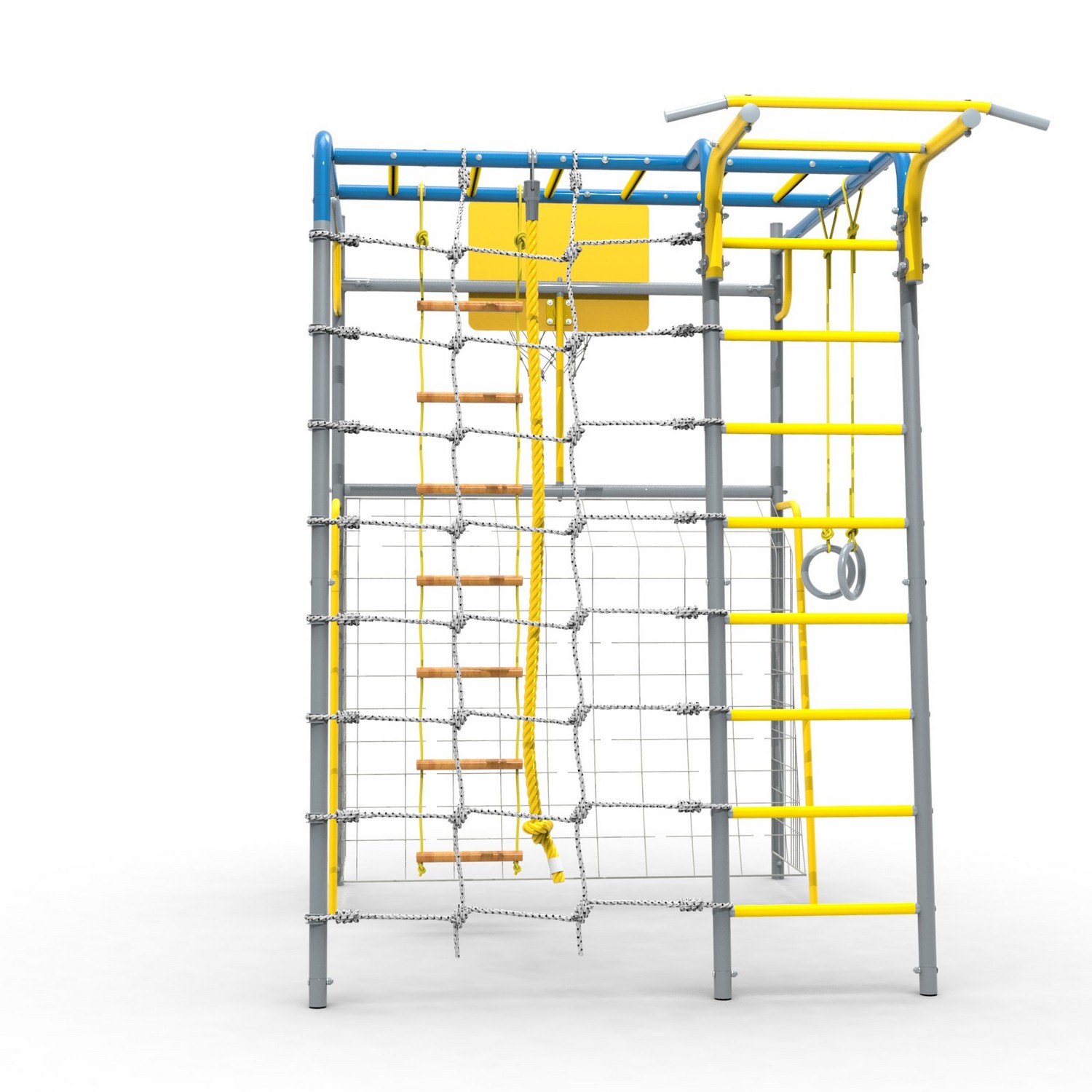 - Комплектация Ворота, сетка для лазания, кольца гимнастические, канат, кольцо баскетбольное, лестница веревочная, турник (регулируемый по высоте), рукоход, ступени ПВХ